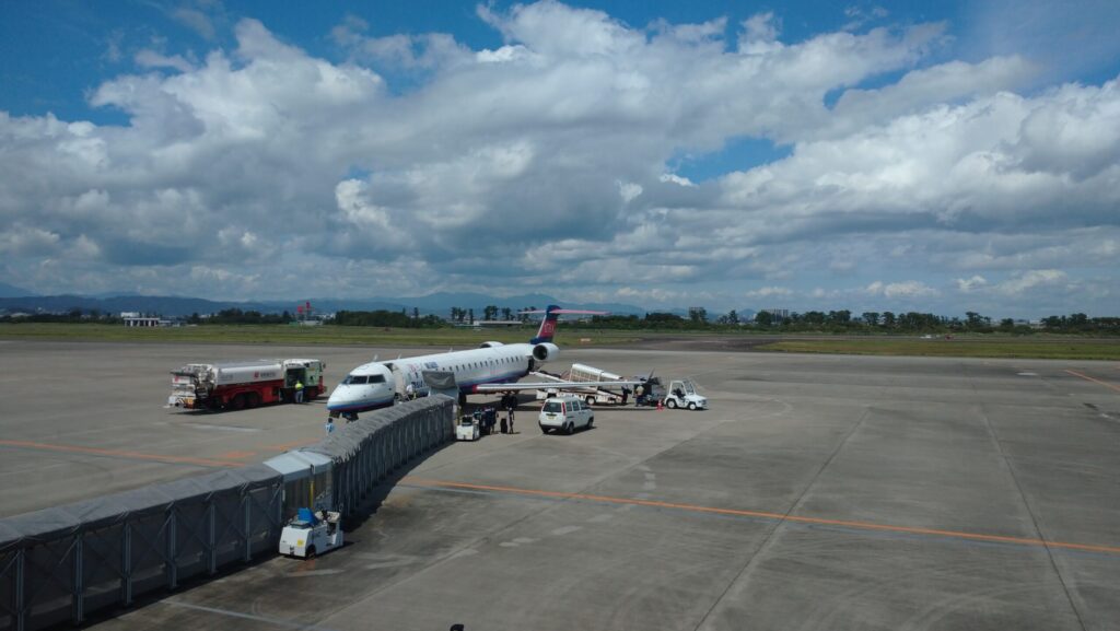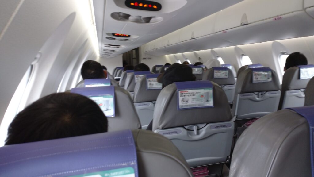 • 座席幅: 新幹線に比べるとややタイトに感じるが、シートピッチ(前後幅)は標準的。特別窮屈に感じることはなく、1時間半のフライトなら十分に快適。