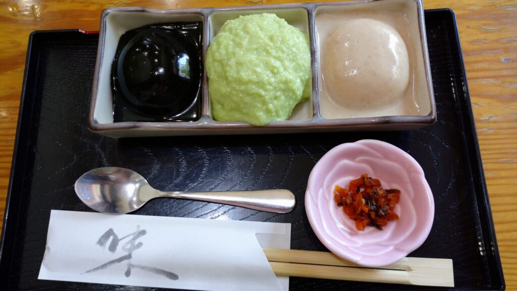 運ばれてきたお盆には、色鮮やかな三色の餅と、口休めのお漬物。