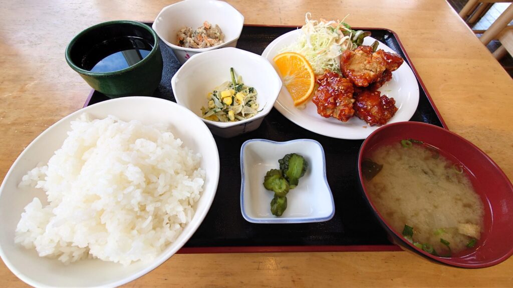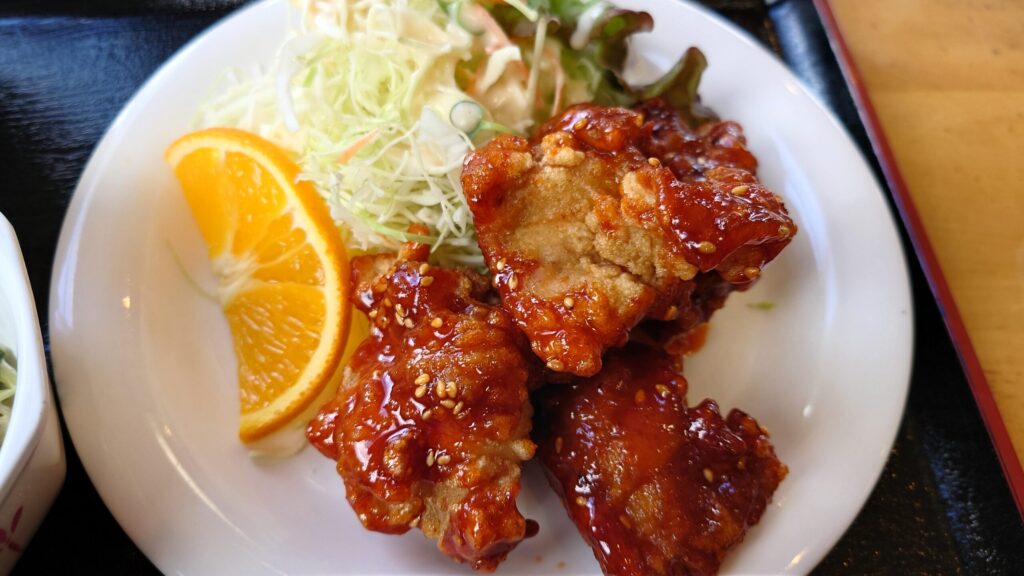 小鉢はいい意味で期待を裏切らない「ああ、これこれ」という味。メインのから揚げは辛すぎず、絶妙にごはんを泥棒していく優秀で罪なやつ。