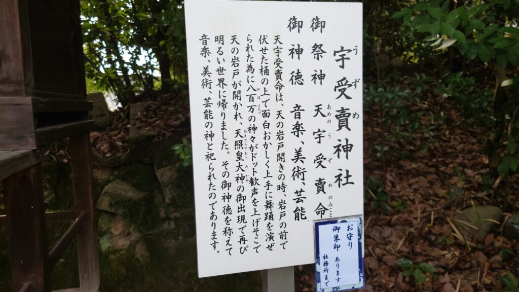 一方、アメノウズメは境内末社の宇受売神社に祀られている。要するに、艮神社のメインの御祭神ではない。